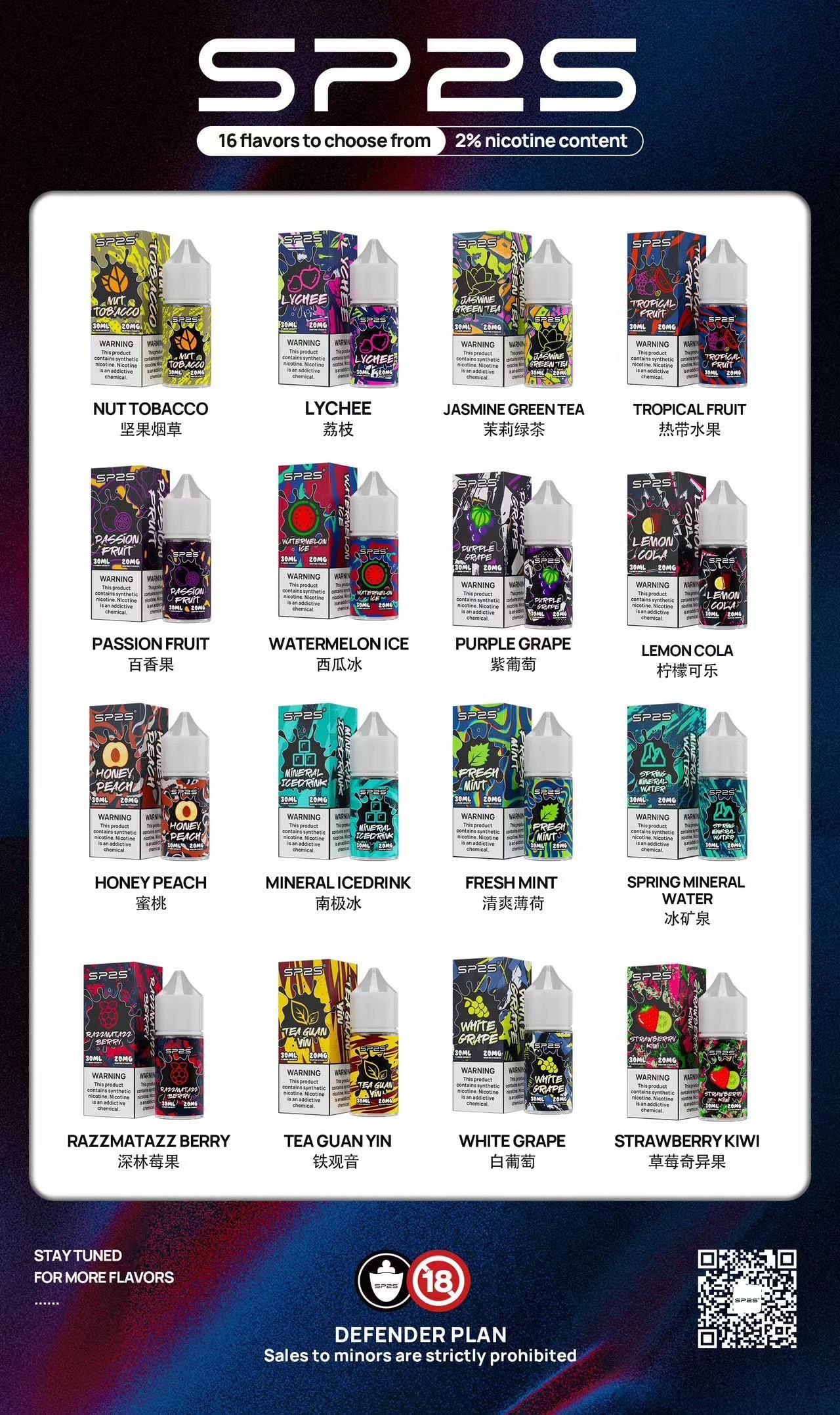 尋找高品質電子煙油?SP2S隆重推出16款全新煙油,為您的vaping體驗開啟前所未有的味蕾冒險!每一瓶30ml煙油均採用頂級原料精緻釀造,嚴格把關生產細節,確保純淨順滑的口感;搭配20mg適中尼古丁含量,既能滿足煙癮需求,又不會帶來過重負擔,適合多數電子煙使用者。